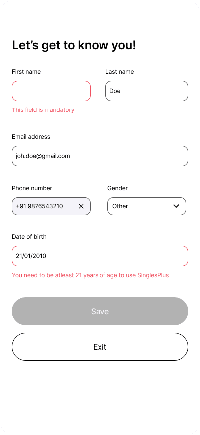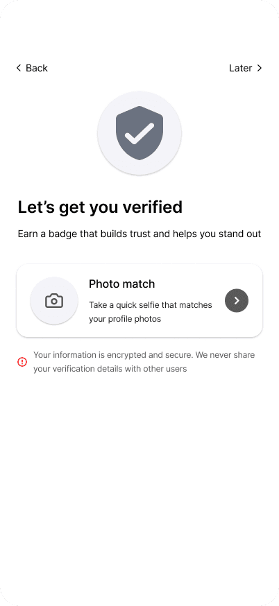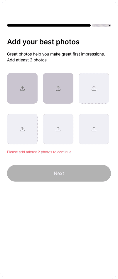 Social connection apps require detailed information, but early friction causes drop-off. Onboarding was broken off into progressive phases.
