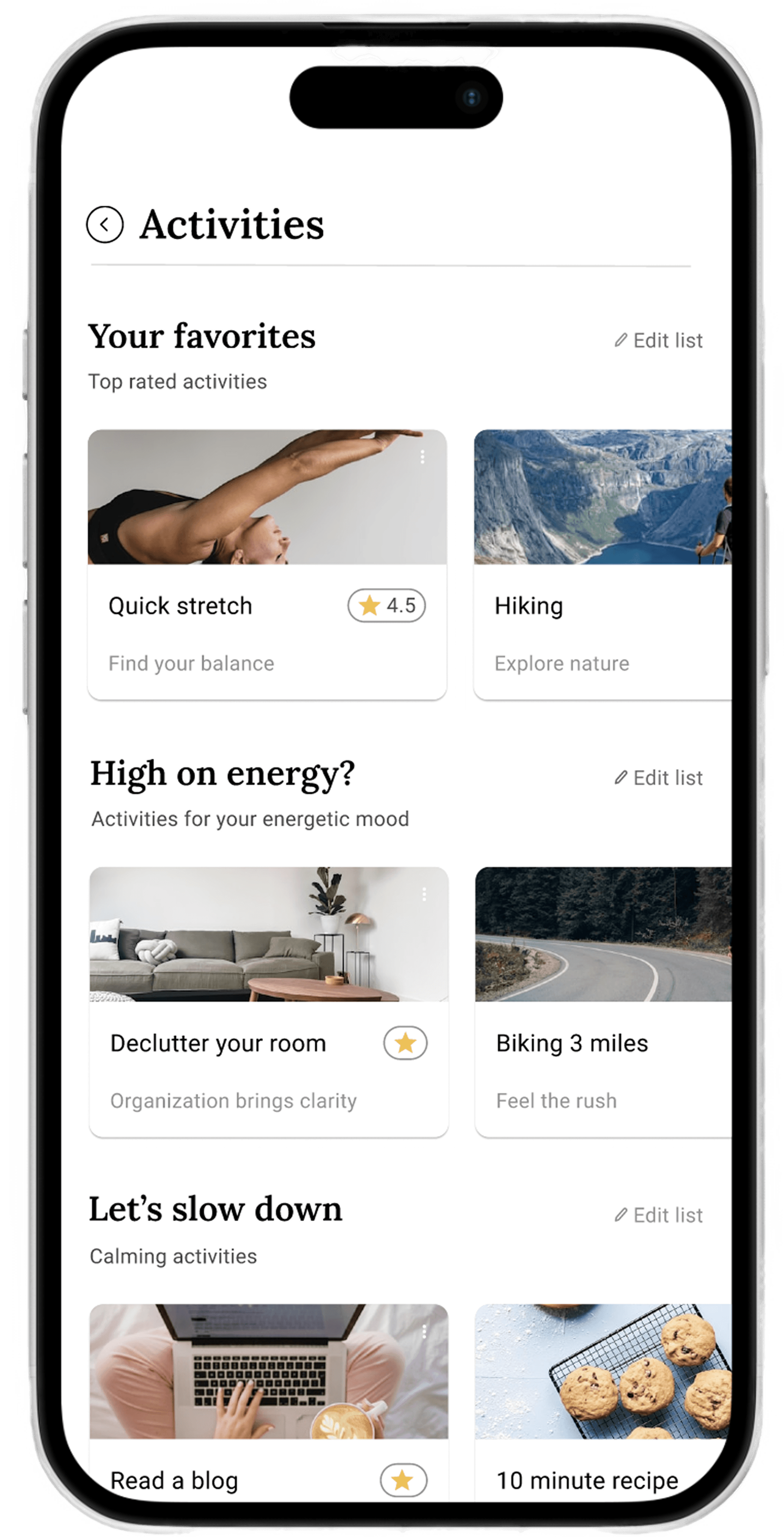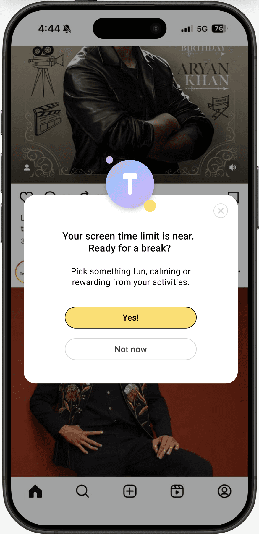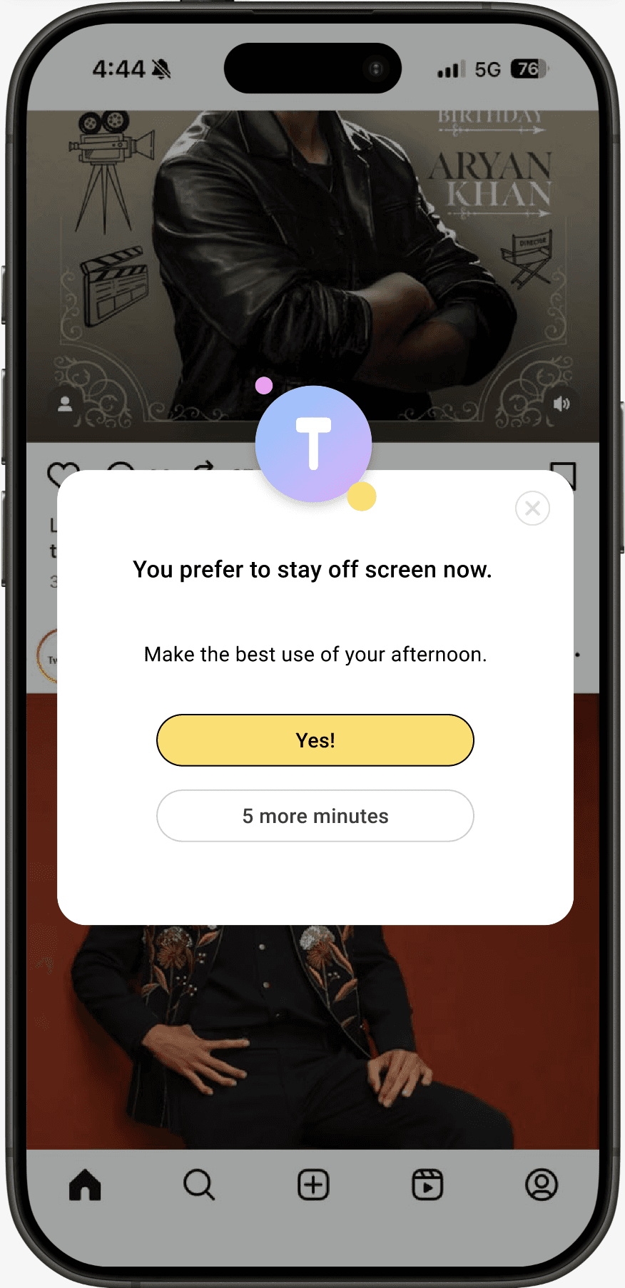 It supports users in making mindful decisions during high-risk moments such boredom, breaks or before bed, when users are most likely to doom scroll on their devices and encourages them to reconnect with offline activities that make them feel present, capable, and fulfilled.